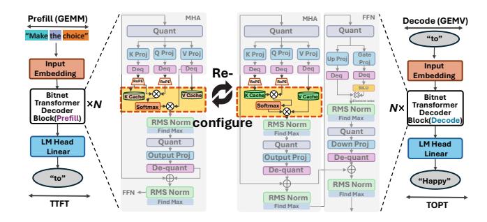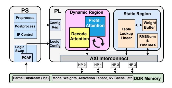 Table Lookup Linear, RMSNorm, 其他 element-wise operators。Prefill RM 偏 compute-heavy,Decode RM 偏 KV-cache-centric。static region + reconfigurable partition (RP)。prefill attention RM,进入生成阶段后切到 decode attention RM。PS 通过 PCAP 下发 partial bitstream,只重配置 dynamic region。