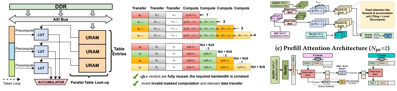 Linear projections 在两个阶段都用 TLMM,权重常驻片上。Prefill attention: 类 FlashAttention block processing,重点是 Q reuse 和 token-level parallelism。Decode attention: L=1,没有 Q reuse,退化成面向 K/V cache 的 memory-bound 流程。TLMM 做 projection,dynamic region 里是 prefill attention RM。Q 复用。partial reconfiguration,换成 decode attention RM。KV-cache-centric decode 数据流,重点拉高 DDR 有效带宽。Q 直接旁路进片上 buffer,输出先本地缓存再回写。